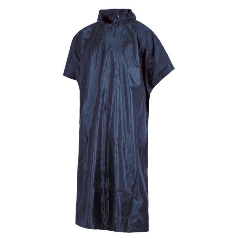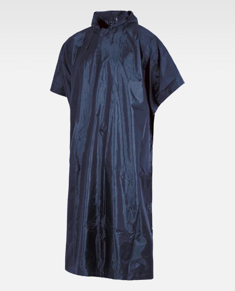 Capa impermeável com capuz. Fecho de colchetes na gola e lateral.