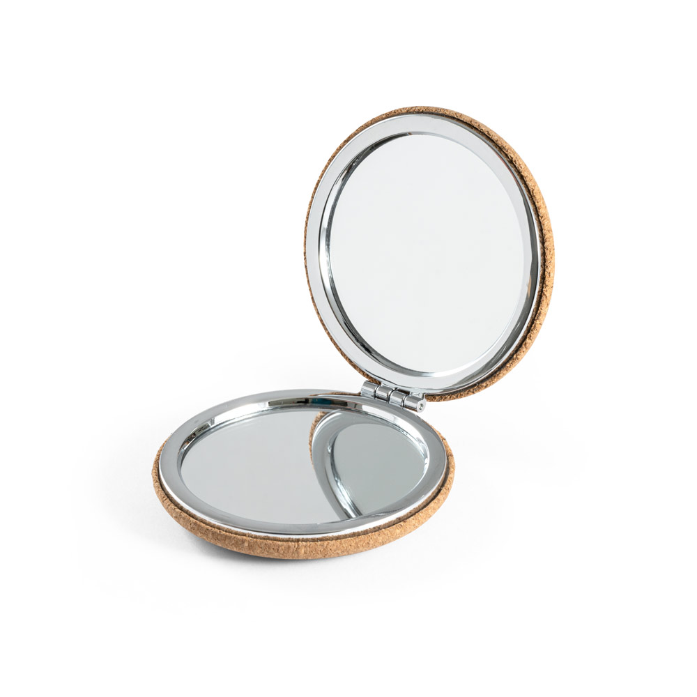 Espelho de bolsa duplo em cortiça com fecho magnético.