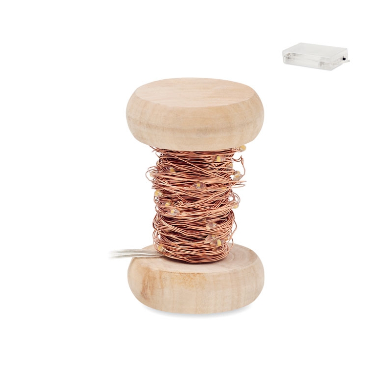 Fio de 50 luzes LED em amarelo quente numa bobina de madeira.