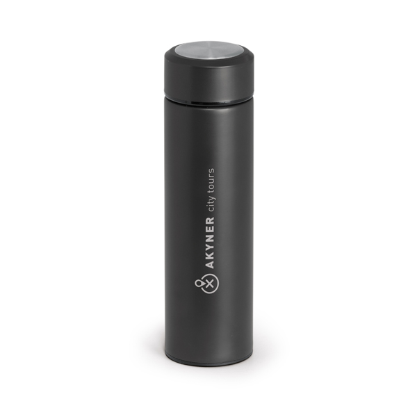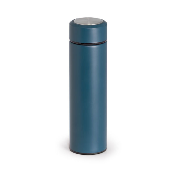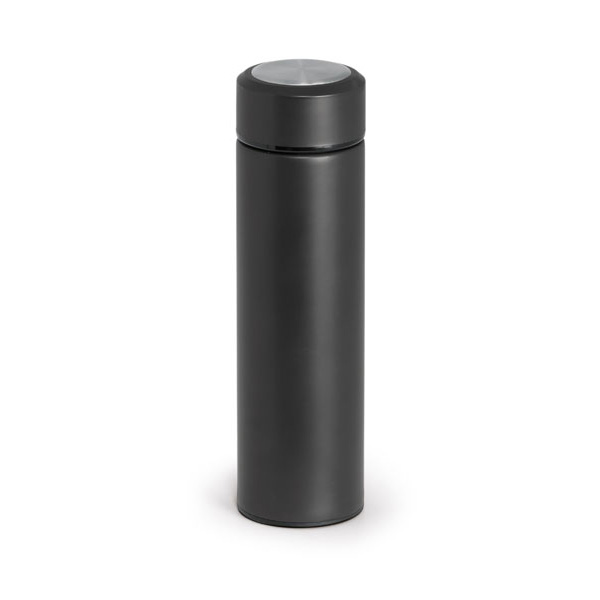 Garrafa termo. Aço inoxidável. Com corpo duplo e infusor para chá. Capacidade até 470 ml. Fornecida em caixa. ø65 x 230 mm