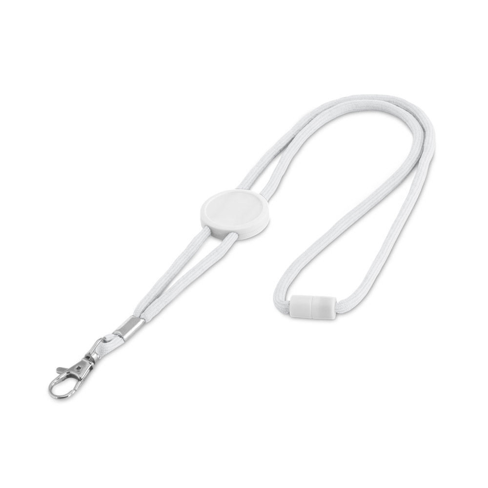 Lanyard em poliéster, ajustável, com mosquetão em metal e fecho de segurança.