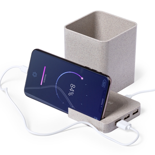 Porta-lápis, Inalambrico 5W, multifunções 4 em 1 em palha de trigo e ABS com cabo micro USB em cor branca de 1 metro de comprimento.