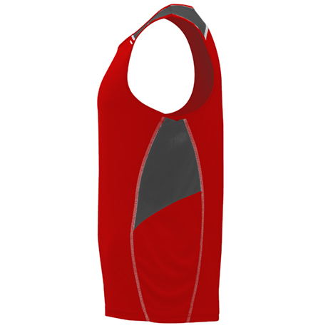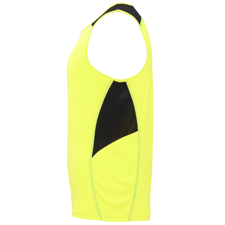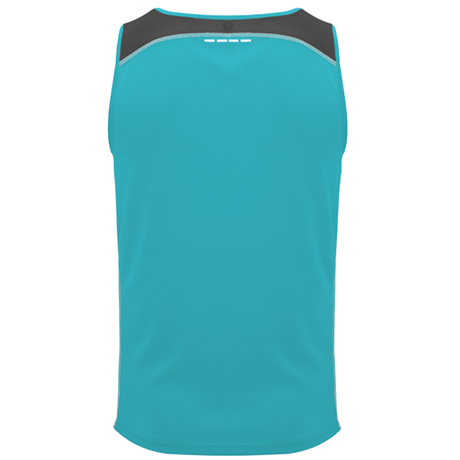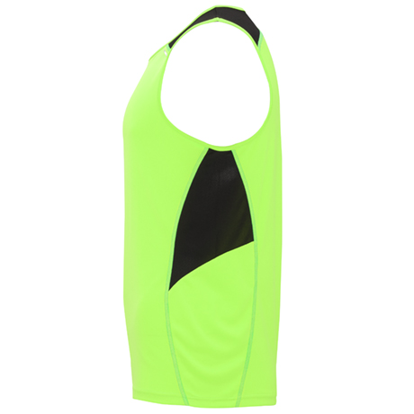 Com gola redonda com tapa costuras e dois tecidos de poliéster em três cores. Tecido principal “Interlock”, encaixes laterais e superiores em tecido microperfurado.